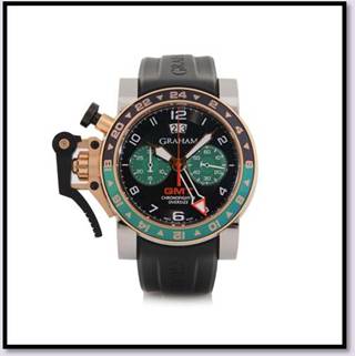 Lotto 200 GRAHAM GMT CHRONOFIGHTER N. 064 SERIE ATTUALE. Cassa massiccia in acciaio e oro rosa 18 kt con oblò sul fondello chiuso da viti, pulsante in corona al 9 con leva di comando, pulsante tondo per azzeramento al 10, anse curve, lunetta graduata bicolore nera e verde, vetro zaffiro (cottimo). Quadrante bicolore nero e verde con indici, numeri arabi e lancette luminescenti, contatore a 30 minuti, lancetta per fuso orario al centro e data al 12 (ottimo). Movimento a carica automatica (ottimo). Quadrante, cassa e movimento firmati. Completo di cinturino in caucciù, fibbia in acciaio, astuccio e certificato originali. Diam. mm 46. base d’asta: 5.000 €