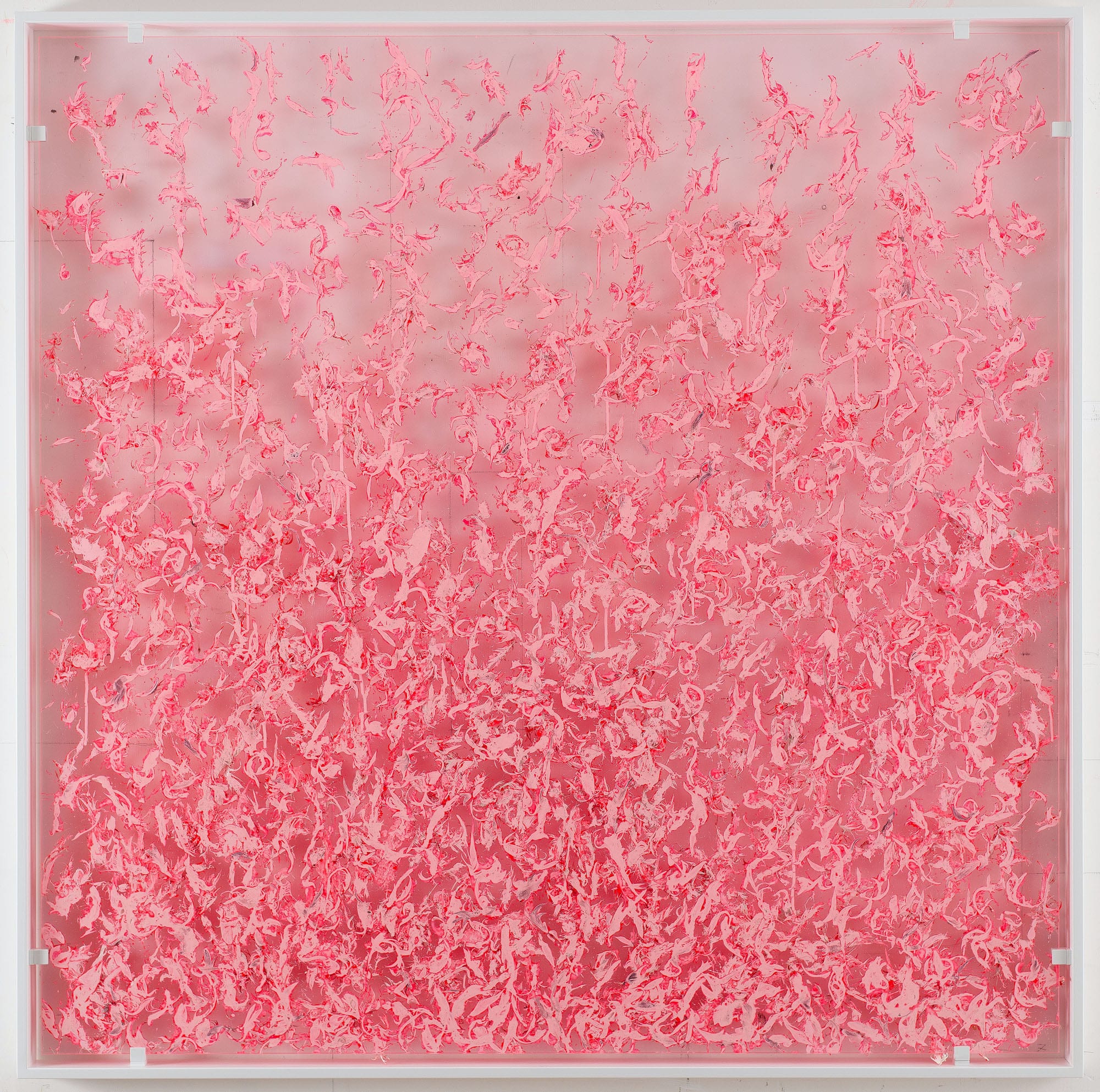 A completare l’opera è una cornice appositamente progettata che funge anche da ‘schermo’ poiché nel suo bordo interno si riverbera il colore sintesi di quello del plexiglas stesso e della materia pittorica.
