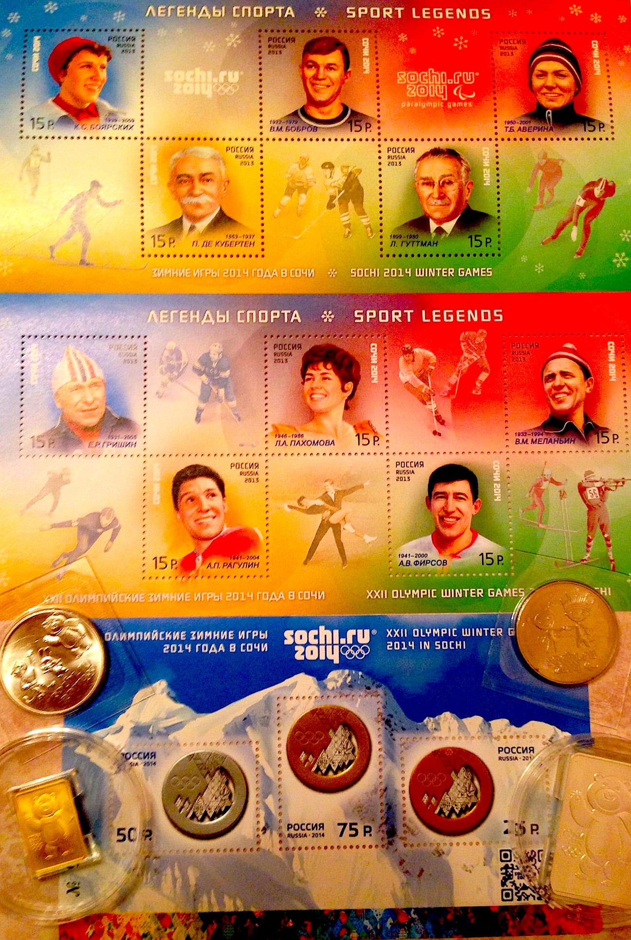 Помимо филателии, в России выпущены четыре разновидности монет номиналом в 25 рублей с изображением символов Олимпиады, и 100- рублевая банкнота с изображением сноубордиста. Интерес к почтовым маркам и открыткам, проявляется не только среди коллекционеров, но и среди обычных жителей России, особенно к сторублевой купюре после победы Виктора Уайлда. Видимо, сто рублей и на Олимпиаде сто рублей. Хотя, замечу, что сто друзей, как поется в известной песне, конечно, лучше. Особенно, если друзья из «Сбербанка» России, который, кстати, серьезно и красиво, выпустил монеты из серебра и золота с изображением талисманов Олимпиады и видов спорта, участвовавших в состязаниях в Сочи.