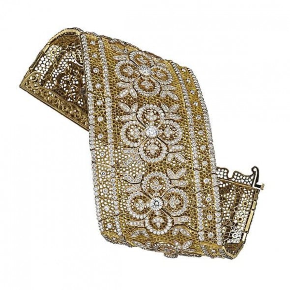 Tulle bracelet, yellow gold and diamonds. Spearhead of the Italian goldsmith’s excellence, jeweler among the most sought-after by royal houses, celebrities and high finance personalities, valiant supporter of the goldsmith’s techniques dating back to Renaissance times, Buccellati proposes a bracelet which is a true simbol of his style. The inspiration directly comes from the Doge’s Palace, facing St. Mark’s square in Venice: the texture is soft, the lines of its design are light, the floral motifs of the palace’s façade are reproduced all along the band in yellow gold, set with brilliant-cut diamonds and enhanced by a contour of leaves. The elegant rhythm of flowers and leaves, and the vibrating emotion of the exclusivity of the jewel, make this bracelet a true symbol of what Buccellati handcrafting skills can do: at Buccellati’s, everyone is professional because they preserve the experience of more than a century of presence on international markets, and this renders the brand a true milestone in jewelry making.