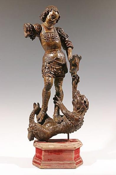 The statuette corresponds remarkably closely with an important – much larger, and better preserved – statue that forms the focus of the altar of a chapel dedicated to the Archangel in the left transept of the Church of the Frari in central Venice. It is likely, given the history of the re-commissioning of the chapel in Venice in 1478 by Giacomella Trevisan, that the central St Michael, bigger and more dramatic than his companions (even the dying soldier, St Sebastian!), was added then. Now, the way in which St Michael’s armour is described in the wooden statuette, with far greater emphasis on its ornamentation all’antica, is strongly reminiscent of the Florentine Renaissance. This could have been transmitted to Venice by the presence there in the relevant decade of Andrea del Verrocchio, who was involved from 1481-1488 in making the full-scale models for the horse and rider to commemorate Bartolommeo Colleoni, which – owing to the sculptor’s Death – were cast in bronze by the local expert, Giacomo Leopardi. The statuette therefore – quite apart from its immediate charm and vivacity – may be seen as an interesting exemplar of the effect of Verrocchio’s scintillating presence in the lagoon city on native artists, one of whom – a master wood-carver – was evidently capable of absorbing and then transmitting the novel style of the Renaissance, which had been late in arriving there. The strength of character of the statuette promises that – with future increased knowledge of wood-carving in the Veneto – its talented author may eventually be determined.