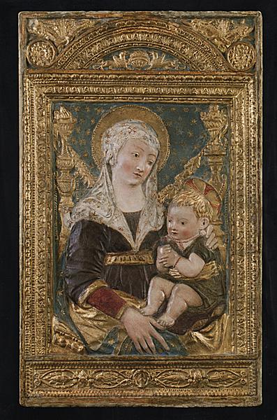 Polychrome stucco bas-relief in ‘Schiacciato style’ with original gilded stucco frame 81.3 x 56 cm. Provenance Stefano Bardini collection, Florence; Walter and Catalina Von Pannwitz collection, Berlin; Private collection, USA. Literature C.L. Ragghianti, ‘Scultura a Budapest’, in Critica d’Arte, XLI, 1976, 147, pp. 67-71; P. Lorenzelli, A. Veca exh. cat. Una moda antiquaria, in TRA/E Teche, pissidi, cofani e forzieri dall’Alto Medioevo al Barocco, Bergamo-London, 1984, pp. 271-288; V. Sgarbi, Domenico di Paris e la scultura a Ferrara nel Quattrocento, Milan 2006; F. Petrucci, Da Firenze marmi e terrecotte invetriate: Antonio Rossellino e Andrea della Robbia per Ferrara, in Crocevia Estense. Contributi per la storia della Scultura a Ferrara nel XV secolo, Ferrara 2007, pp. 151-188; G. Gentilini, F. Ortenzi, Dal rilievo alla pittura. La Madonna delle Candelabre di Antonio Rossellino, Firenze 2008