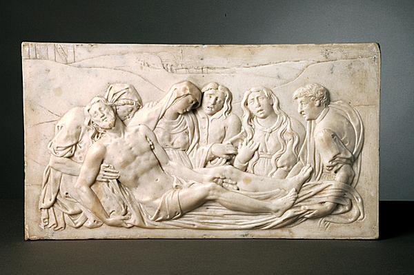 This is a work of art that one may immediately be drawn to on account of the refinement of the marble grain, the mellowness and the brilliance of the patina and the quality of the workmanship, all factors revealing a hand that was able to graduate the different depths of the composition by means of employing minimum variations, with stiacciato low relief effects. The size and the shape of the small panel, which was probably originally intended to be placed between a structure that would also act as its frame, suggest that it might come from a small altarpiece connected to private devotion or from the predella of a marble altarpiece. The recognition of the figurative models in this Lamentation scene shows the author’s familiarity with the Neapolitan artistic tradition in the first half of the Sixteenth century and, in particular, with the works of Giovanni Marigliano da Nola. Among those sculptors who, between the 30’s and 40’s of the Sixteenth century, started collaborating intensely with Giovanni da Nola’s workshop, it was Annibale Caccavello who, culturally-speaking and in his particular style, seemed to correspond to a greater degree to the author of our Lamentation. Indeed, the young sculptor proved able to interact with the master and contributed all the wealth of his own personal figurative experience that had become consolidated by having studied not only Marigliano’s models but also by having studied those of Bartolomé Ordóñez and his brilliant Neapolitan collaborator, Girolamo Santacroce. These were two sculptors who, in early Sixteenth-century Naples, were the precursors of an intense and expressive language, full of abbreviated shapes, even deformed shapes, rendered with a technique – particularly in the case of relief – that preferred a compressed low relief stiacciato, as with Donatello’s later work, in which the figures slot in with each other and accentuate the sentimental power in their features and gestures.