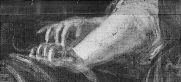 L’iter ideativo del dipinto è riscontrabile dalle radiografie, e mostra come in sostanza l’intera costruzione della figura sia stata impostata mediante un disegno che ha subito pochi ripensamenti, eccezion fatta per il cambiamento di posizione della mano destra della regina, inizialmente sospesa poco sopra il piano dell’ara coperto dal panneggio, e nella stesura definitiva poggiata invece sul panneggio, tenendo l’aspide tra le dita (fig. 1)