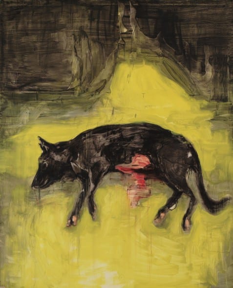 L’ispirazione nasce dal mio pensiero. Le cose che vedo, che vivo, che sogno si sedimentano nella testa e rimangono lí alcune solo per attimi ed altre per anni. Quando riesco le trascrivo su dei fogli facendo delle liste più o meno illeggibili e poi, magari appunto dopo molto tempo, cerco dei punti di riferimento per ricostruirle nei miei quadri. Un esempio il quadro “Lymph, 2013” che rappresenta un cane nero morto sventrato. È un fatto che fa parte della mia memoria infantile… Ero molto piccolo, a Brusson in Val d’Aosta, e al tornare da una gita ci trovammo il sentiero bloccato da questa scena. È una immagine che ho sempre portato con me. E poi qualche mese fa ho fatto delle foto ai miei cani e ho ricostruito il ricordo.