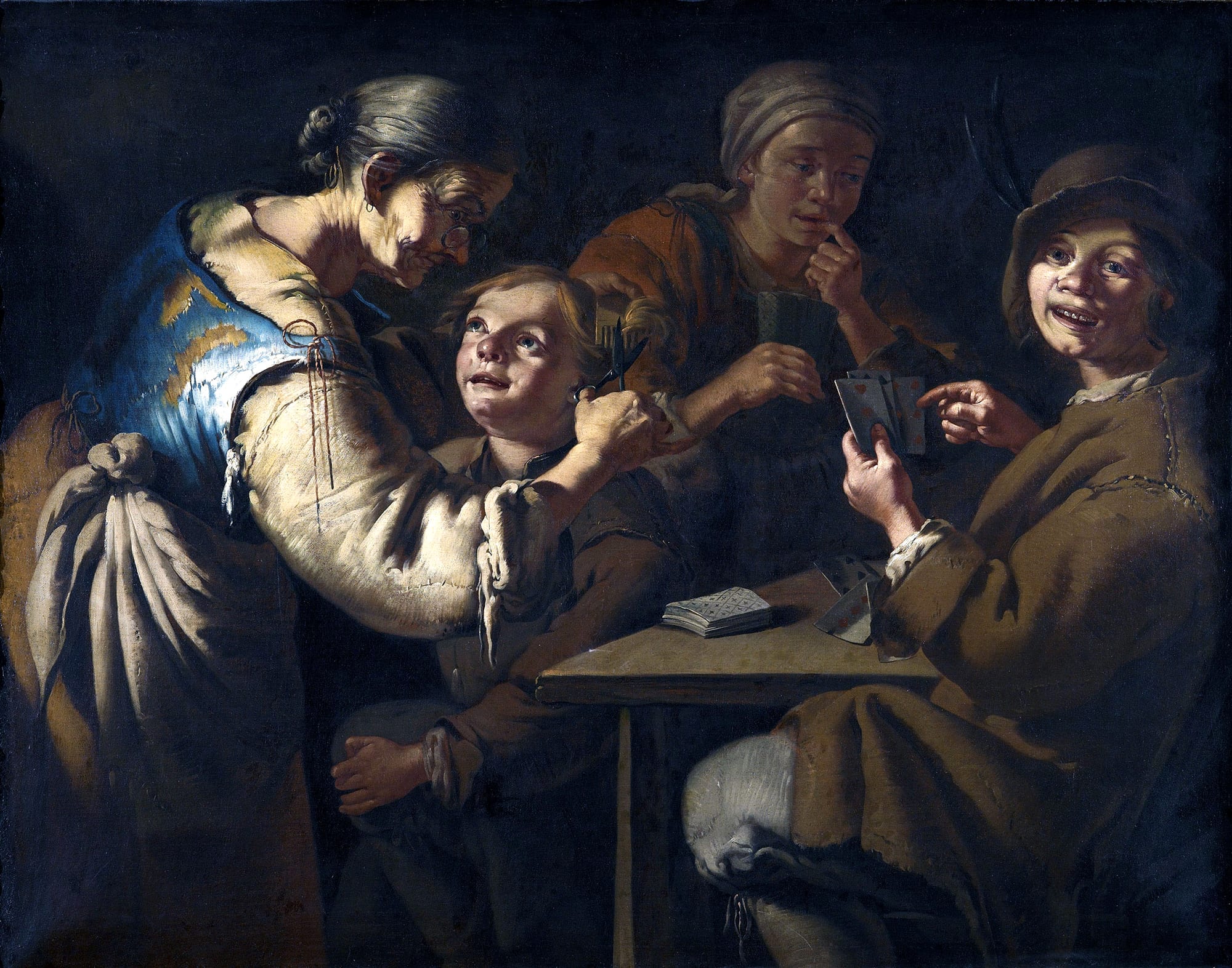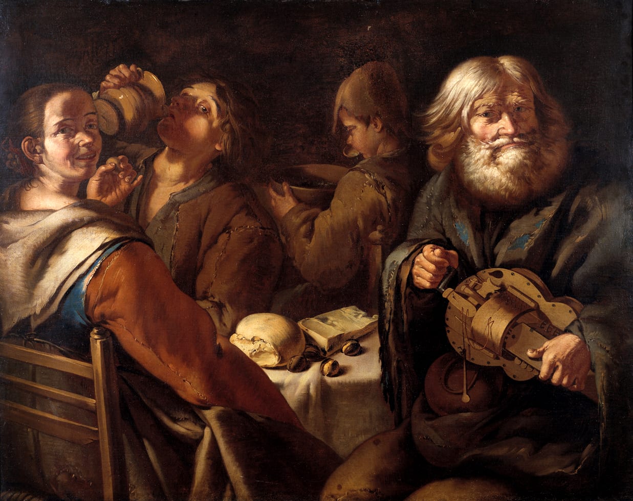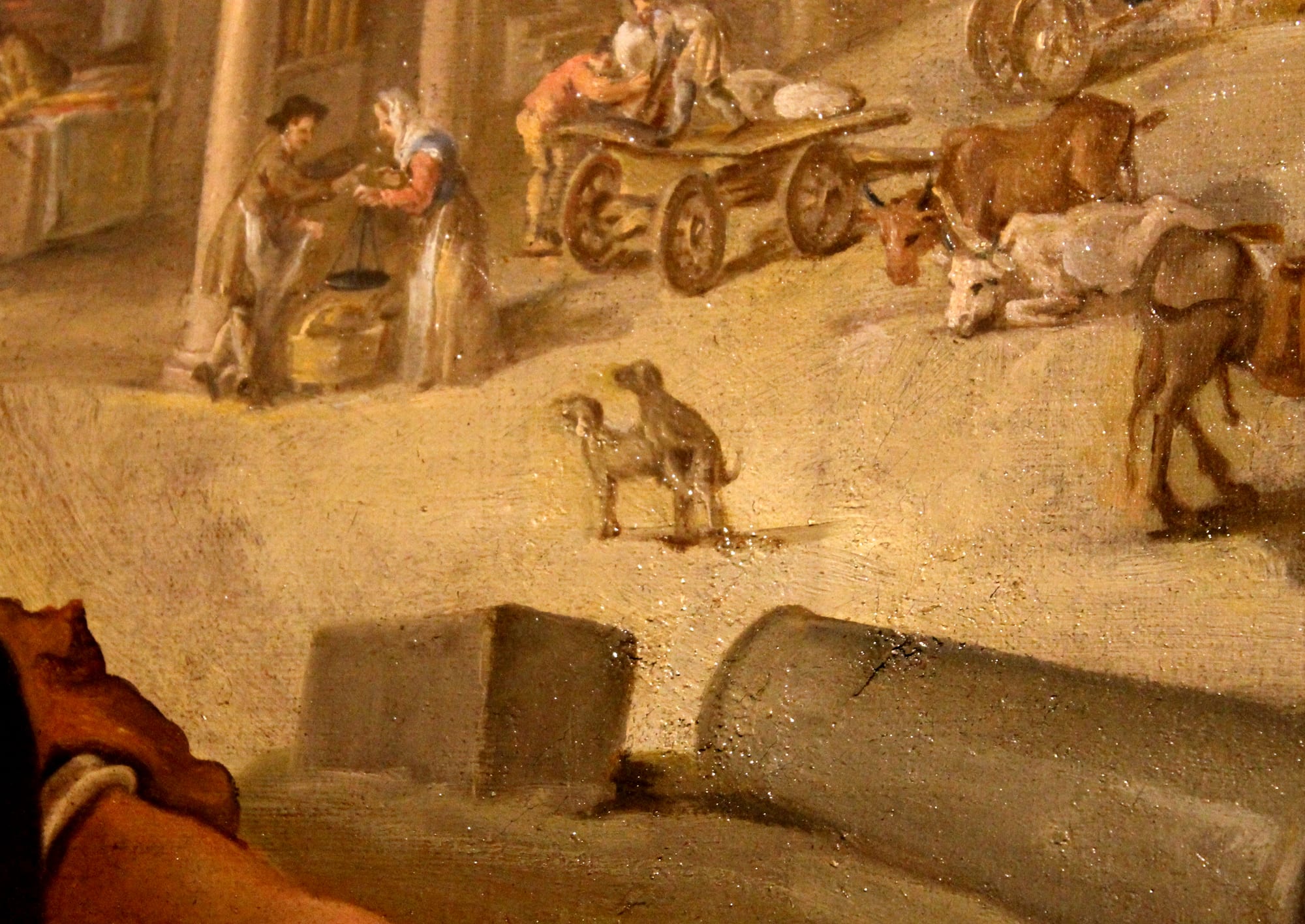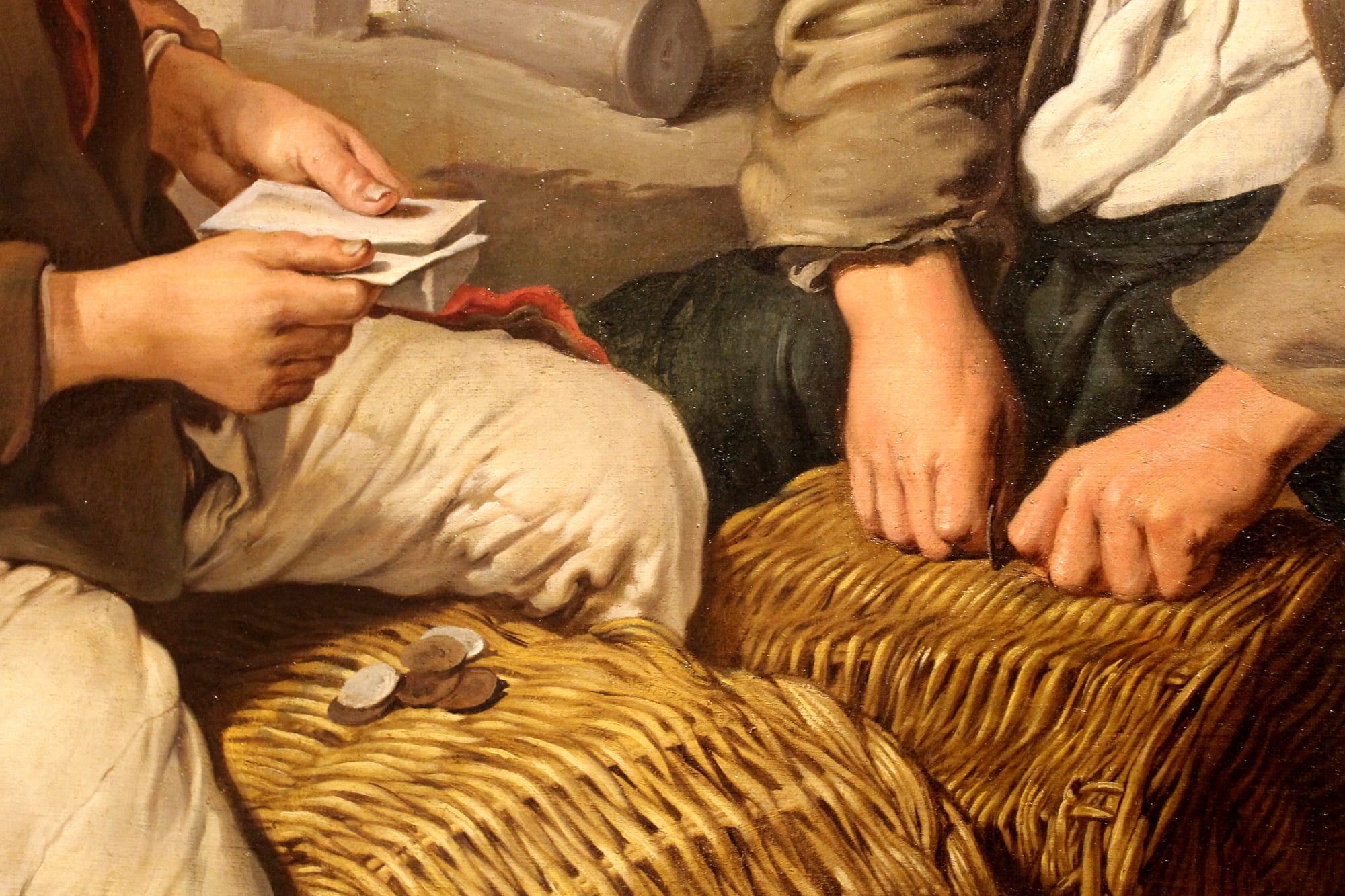 Ma prima di nobildonne e popolane settecentesche, la mostra comincia qualche secolo prima agli albori del Rinascimento in terra bresciana. Vincenzo Foppa quindi, con due tavole di santi e il suo innovativo linguaggio naturalistico che supera di slancio la cultura tardogotica, aprendo la strada ai 3 campioni del Cinquecento: Moretto, Savoldo, Romanino, coloro che, fondendo naturalismo lombardo di matrice leonardesca e cromatismo veneziano di marca tizianesca con qualche contaminazione fiamminga, scrissero un capitolo fondamentale del Rinascimento del Nord Italia. Una grande stagione che purtroppo ebbe pochissimo seguito. Già nel Seicento sono rare le testimonianze artistiche degne di nota: qualche fugace incursione del vicentino Maffei, del milanese Nuvolone e del veneziano di nascita, bresciano d’adozione Andrea Celesti, una sfilata di “natura in posa” e un tuffo nel fiabesco mondo di Faustino Bocchi, abitato da concitati nanerottoli deformi alle prese con gru giganti, gatti “mammoni”, tartarughe nuziali e gamberi feroci, tra balli, feste e concertini pittoreschi. Merita una citazione negli ultimi scampoli di secolo l’originale “San Giovanni Battista e l’agnello” dell’olandese Cavalier Tempesta per il primo piano fotografico al mansueto animale che relega nel secondo il Santo, poi si fa Settecento ed è tempo di pittura di genere, grande tradizione pittorica lombarda tanto cara a Longhi e Testori. Episodi di vita quotidiana e realtà popolare, umili lavoratori e mendicanti. Ad ogni artista la sua peculiarità iconografica. C’è il Todeschini che indaga il mondo pauperistico con intensa partecipazione emotiva, ci sono i caricaturali vegliardi di Cifrondi raffigurati in maniera ironica al limite del macchiettistico. C’è il grandissimo Ceruti con i suoi pitocchi dove invece tutto si condensa nei “ritratti severi di uomini veri” e la pittura di genere si trasfigura in pittura di realtà. Capolavori come la “Madre col bambino“, “Donne al lavoro“, “La spillatura del vino” con quel “garzone d’osteria piegato sulle ginocchia che si volta di scatto accorgendosi della nostra presenza”, e i due “Portaroli che giocano a carte sulle ceste“. Capolavori di vita vera e di grande dignità umana. Scrisse Testori: “Presso il Ceruti, tutto si risolse, anzi, tutto fu nient’altro che ritratto; e, a causa dell’ampiezza e totale umanità di sguardo e riflessione, ritratto del mondo intero“. Non si può che sottoscrivere.