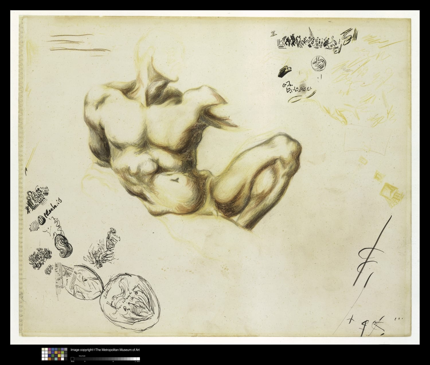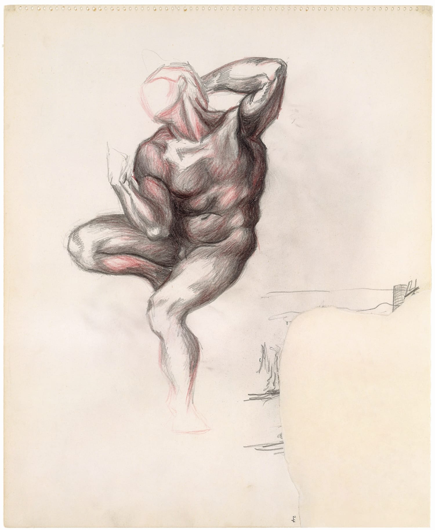 Pollock andò però oltre l’esercizio della copia accademica di capolavori dell’arte rinascimentale e nella fattispecie di Michelangelo. I disegni in mostra manifestano, infatti, il coinvolgimento da lui riposto nello studio delle anatomie e delle muscolature, così da esprimere sentimenti di dolcezza e di grazia, ma anche di tensione e potenza, suggerite dalle rientranze e dalle sporgenze delle belle forme del corpo umano, misurandosi in questo senso proprio con la rappresentazione dinamica ed espressiva delle anatomie, del pieno e del vuoto, delle zone di rilassamento e di massima tensione dei muscoli e della carne. E’ qui che possiamo cogliere le basi delle composizioni astratte di Pollock, qui l’artista è alla ricerca di quel suo linguaggio che lo porterà oltre la tradizione figurativa europea. Tradizione che tuttavia rimase imprescindibile anche dopo il suo deliberato abbandono come ebbe a testimoniare Lee Krasner, artista e compagna di Pollock: “Molti quadri, tra i più astratti, cominciavano con un’iconografia più o meno riconoscibile – teste, parti del corpo, creature fantastiche. Una volta chiesi a Jackson perché non smettesse di dipingere i suoi quadri non appena una data immagine vi aveva preso forma. Mi rispose: Quello che voglio coprire sono le figure”.