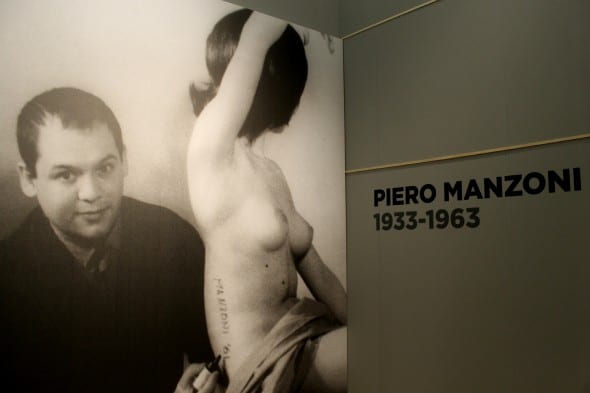 Piero Manzoni è a Milano, finalmente. Il suo viso paffuto e beffardo, del bimbo che l’ha combinata grossa, ci accoglie in mostra mentre firma il fianco di una modella nuda trasformandola in Scultura vivente. Con un anno di ritardo dai cinquant’anni dalla scomparsa e dagli ottanta dalla nascita, la città dove ha vissuto e operato da protagonista gli rende il dovuto omaggio con la “prima vera antologica completa mai realizzata in Italia dalla sua morte”. Geniale, innovatore, controverso. Profetico. Nato a Soncino nel cremonese e morto nel suo studio di Via Fiori Chiari nemmeno trentenne, nel febbraio del 1963, nel culmine della sua attività e consacrazione artistica. Qualche esame di filosofia tra la Sapienza di Roma e la Statale di Milano, tre anni di svogliati studi giuridici alla Cattolica e tantissimo “inventarsi” da sé: ricercare, sperimentare e mettersi in gioco, riflettendo sin dagli esordi su categorie “assolute” e “universali” come “verità”, “assoluto”, “totalità”, “libertà”, “realtà”. E ovviamente l'”essere”, sia nel valore esistenziale che di ente “trasferibile sull’essenza ed essenzialità dell’opera e del fare artistico”, linea guida da seguire e perseguire. Cominciando da “i quadri bianchi” intitolati “Achrome” ossia “senza-colore”, “incolore”, “neutri”. Quadri “antimateria” che si fanno oggetto, desolata presenza, vuoto, “così semplici, così vicini al niente”. Kierkegaard, Nietzsche, Heidegger e Sartre in testa e un padre artistico, spirituale ma anche affettivo, dai soggiorni comuni ad Albisola ai Bagni Pescetto, come Lucio Fontana.