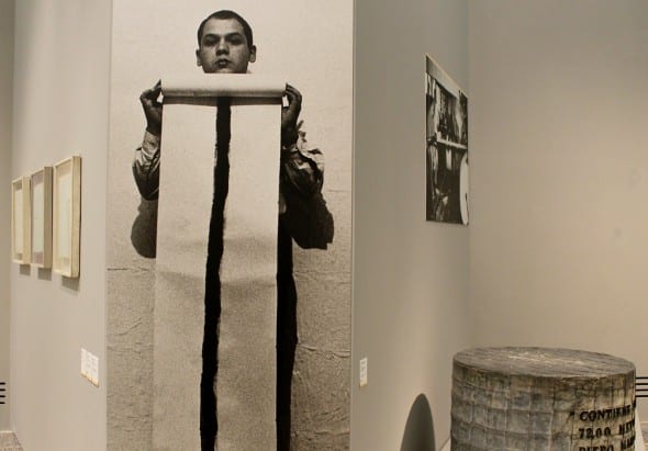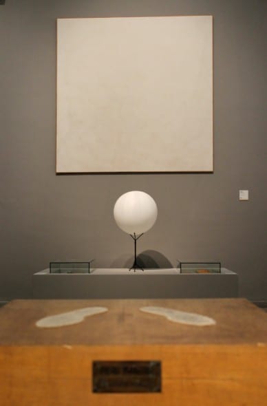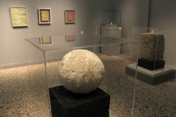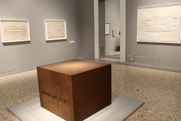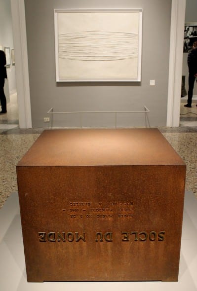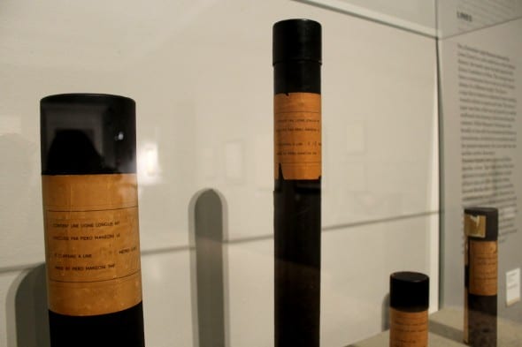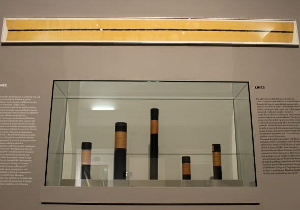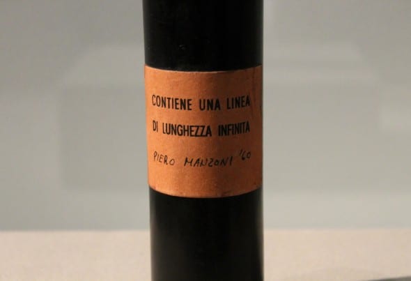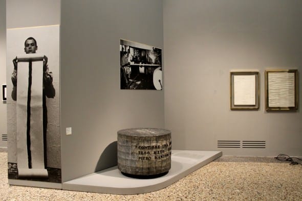 “Basi magiche” in legno su cui poggiare e creare “Sculture viventi“, “Basi del mondo” di bronzo capovolte per trasformare in opera d’arte la Terra intera. Il gesto assoluto e infinito di Linee chilometriche avvolte e raccolte in tubi di cartone e cilindri di zinco. La dimensione totalizzante degli Achromes, grinzati, pelosi, cuciti. Uova sode consacrate da impronte digitali. Michette e caolino, pallini di ovatta, polistirolo espanso, cotone idrofilo. “Teatri pneumatici“, Afonie musicali, astrazioni cartografiche. Corpi, d’aria, Fiati, catturati in palloncini di plastica, e Merde, inscatolate come conserve – “conservate al naturale e Made in Italy“. Tutto certificato ad arte. Tutto “d’artista”. Tutto da consumarsi rigorosamente entro il 2 giugno 2014 nelle sale di Palazzo Reale.