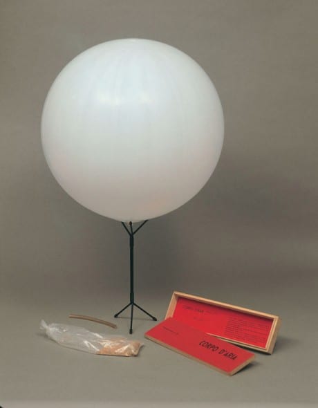 (Sempre Gualdoni dal catalogo della mostra: “Come nelle Linee anche i Corpi d’aria si presentano con l’aspetto di un prodotto seriale realizzato in numerosi esemplari, ancorché all’atto del compimento dell’operazione ogni esemplare assuma un carattere di unicità (…), allo spettatore è richiesto un atto di pura condivisione intellettuale, in assenza dell’esperienza fisica dell’opera. (…) Anche in questo caso è decisivo il rapporto tra la fisicità della cosa e il suo prezzo in quanto opera d’arte: attribuire un valore mercantile secondo parametri artistici a qualcosa che non si può verificare rende esplicito che l’oggetto della compravendita è l’adesione dell’acquirente all’identità, all’esistenza, al pensiero dell’autore. E’ COMPRARE MANZONI, non COMPRARE UN MANZONI“)