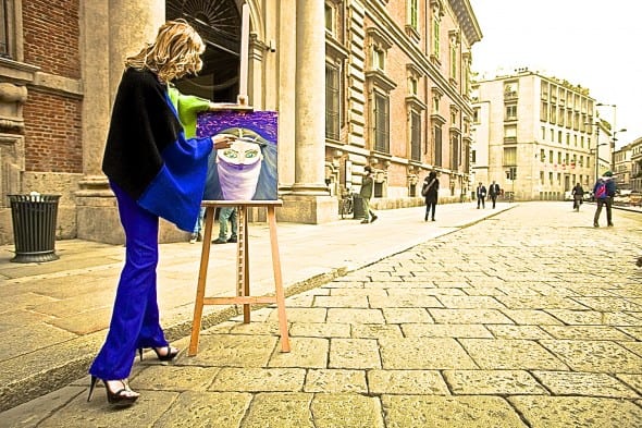 And today, I would like to invite my readers to the a colorful performance “The magic of Colors” in the Design Week at colorfully decoration garden of the palace Cusani. Here, within 3 days I will be drawing using “Oikos” products, turning wood to metal, metal to stone, glass at bronze, like an ancient alchemist. These properties of the “optical illusion” effect I was taught in the laboratory of the company when I was training in their headquarters in Gatteo di Mare.