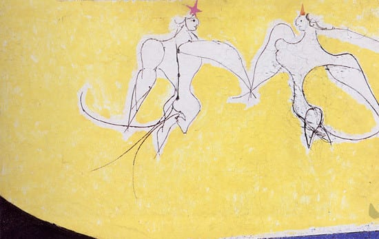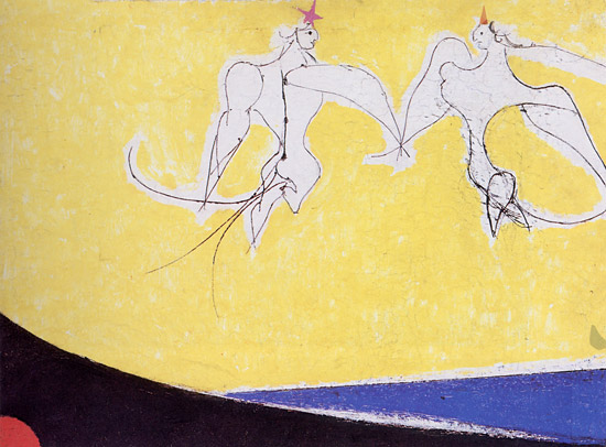 Gli angeli sono la trasposizione pittorica più diretta di un temperamento errante, erotico, eretico: si muovono liberi in un cielo senza nubi avendo sotto di loro la linea che evoca la terra e il mare. Il segno è chiaro e sicuro e lui se ne serve con naturalezza per costruire uno spazio senza vincoli geometrici; le calligrafie aeree si induriscono a volte nel tratteggiare il volto degli angeli, impalpabili eppure implacabili.