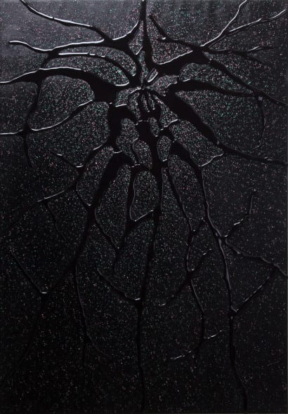 Вы видели картины, где я провожу многослойную работу, используя особую технику совмещения, с применением термоизоляционного пластика, который является индустриальным материалом. Так я делаю свои картуши. Я играю с тонами: на черную основу я наношу черный пластик. И эта форма дает особый эффект при естественном освещении. Это особая игра отражений.