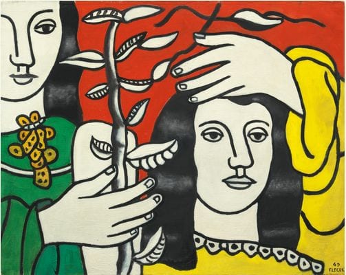 PROPERTY FROM A PRIVATE AMERICAN COLLECTION FERNAND LÉGER 1881-1955 DEUX FIGURES ET UNE FLEUR Signed F. Léger and dated 49 (lower right); signed F. Léger, dated 49 and titled on the reverse Oil on canvas 28 3/4 by 36 1/4 in. 73 by 92 cm Painted in 1949. Estimate 3,000,000 — 5,000,000 USD