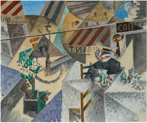 GINO SEVERINI 1883 – 1966 LA TERRASSE D’UN CAFÉ DE MONTMARTRE Signed G. Severini (lower right); signed Gino Severini and inscribed Le déjeuner à la terrasse on the reverse Oil on canvas 18 1/4 by 21 5/8 in. 46.3 by 55.3 cm Painted in 1913. Estimate 1,000,000 — 1,500,000 USD