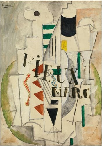 PROPERTY FROM AN IMPORTANT PRIVATE COLLECTION PABLO PICASSO 1881-1973 GUITARE, VERRE, BOUTEILLE DE VIEUX MARC Signed Picasso (upper left) Oil on canvas 18 1/8 by 13 1/4 in. 46.2 by 33.7 cm Painted in Summer 1912. Estimate 5,000,000 — 7,000,000 USD