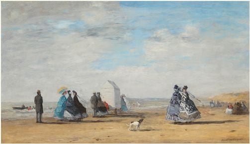 PROPERTY FROM A PRIVATE AMERICAN COLLECTION EUGÈNE BOUDIN 1824-1898 SCÈNE DE PLAGE À TROUVILLE Signed E. Boudin and dated 1864. (lower right) Oil on cradled panel 10 7/8 by 18 3/4 in. 27.6 by 47.6 cm Painted in 1864. Estimate 700,000 — 1,000,000 USD