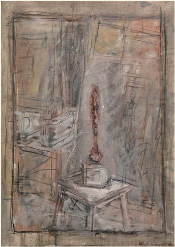 PROPERTY FROM AN IMPORTANT PRIVATE COLLECTION ALBERTO GIACOMETTI 1901 – 1966 ATELIER I Signed and dated Alberto Giacometti 1950 (lower right) oil on canvas 25 3/4 by 18 1/8 in. 65.2 by 46 cm Painted in 1950. Estimate 3,000,000 — 4,000,000 USD