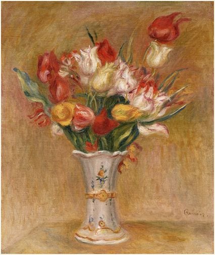 PROPERTY FROM A PRIVATE EUROPEAN COLLECTION PIERRE-AUGUSTE RENOIR 1841-1919 TULIPES Signed Renoir (lower right) Oil on canvas 21 7/8 by 18 1/4 in. 55.5 by 46.4 cm Executed in 1909. Estimate 1,500,000 — 2,000,000 USD