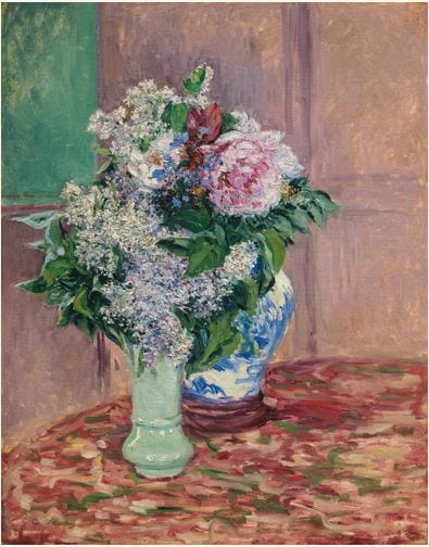 PROPERTY FROM AN IMPORTANT PRIVATE COLLECTION, CONNECTICUT GUSTAVE CAILLEBOTTE 1848 – 1894 LILAS ET PIVOINES DANS DEUX VASES Signed G Caillebotte (lower left) Oil on canvas 36 1/4 by 28 3/8 in. 92 by 72 cm. Painted in 1883. Estimate 1,000,000 — 1,500,000 USD