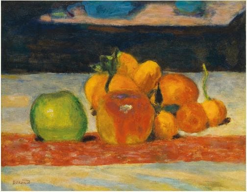 PROPERTY FROM A DISTINGUISHED COLLECTION PIERRE BONNARD 1867 – 1947 NATURE MORTE, FRUITS Stamped with the signature (lower left) Oil on canvas 12 3/8 by 15 7/8 in. 31.5 by 40.5 cm Painted circa 1942. Estimate 600,000 — 800,000 USD