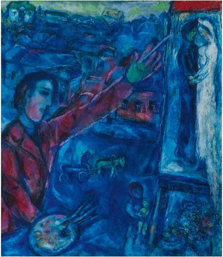 PROPERTY FROM A PRIVATE EAST COAST COLLECTION MARC CHAGALL 1887 – 1985 LE PEINTRE DEVANT LE CHEVALET Signed Marc Chagall (on the reverse) Oil, colored ink and India ink on canvas 33 by 29 1/8 in. 83.8 by 74 cm. Painted 1945-69. Estimate 2,000,000 — 3,000,000 USD