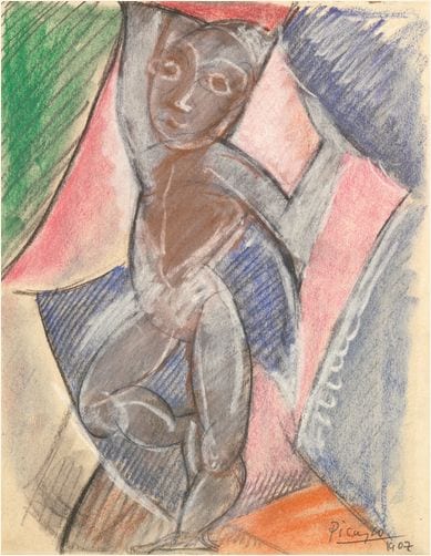 PROPERTY OF A PRIVATE COLLECTOR PABLO PICASSO 1881-1973 NU AUX BRAS LEVÉS Signed Picasso and dated1907 (lower right) Pastel, black chalk and pencil on paper (recto) Pen and red ink on paper (verso) 9 1/2 by 7 1/2 in. 24 by 19 cm Executed in 1907. Estimate 1,500,000 — 2,000,000 USD