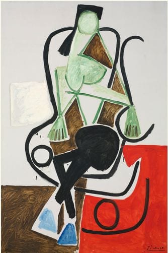 PABLO PICASSO 1881 – 1973 FEMME ASSISE DANS UN FAUTEUIL Signed Picasso (lower right), Oil on panel 39 3/8 by 31 1/2 in. 100 by 80 cm Painted on March 5, 1953. Estimate 8,000,000 — 12,000,000 USD