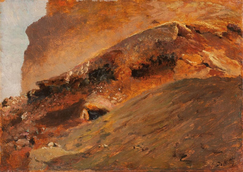 Lo stesso giorno, a seguire, il dipartimento di Arte del XIX secolo propone una nutrita selezione di opere. Spicca l’opera L’Antico Lung’arno delle Grazie di Lorenzo Gelati (Firenze 1824 – 1895), (stima € 18.000 – 25.000), che rappresenta una preziosa testimonianza pittorica ed iconografica della Firenze del tempo. Interessanti due dipinti di Nicolò Barabino (Sampierdarena 1832 – Firenze 1891), I Vespri Siciliani e Carlo VIII e Pier Capponi (stimati entrambi € 3.000 – 5.000), che costituiscono i bozzetti per i due famosi affreschi presenti in Palazzo Celesia a Genova. Infine si segnala una serie di tavolette di Giuseppe de Nittis (Barletta 1846 – Saint Germain en Laye 1884), risalenti ai primissimi anni ‘70 dell’Ottocento e raffiguranti suggestivi e sintetici studi eseguiti sulle falde del Vesuvio (vd. Lava del Vesuvio, stima € 11.000 – 15.000).