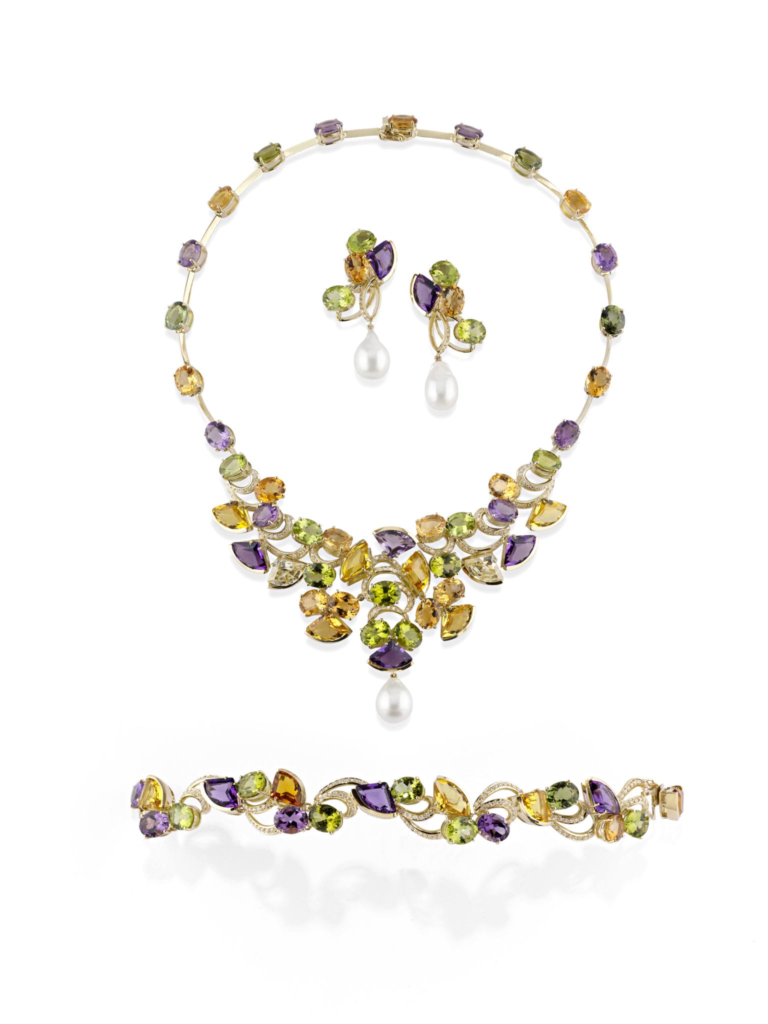 Assolutamente contemporanea, infine, una demi parure, in oro, pietre di colore, perle coltivate e diamanti realizzata dalla maison del gioielliere romano Giuliano Ansuini. Composta da una collana (lotto 401 stima 6.000 – 8.000 euro) – realizzata nella parte centrale con un motivo di volute decorata con quarzi citrini, peridoti e ametiste di taglio fantasia e ovale, diamanti di taglio brillante da cui pendente una perla coltivata di mm 12.07; nella parte posteriore con quarzi citrini, peridoti e ametiste di taglio ovale – e un bracciale (lotto 403 stima 3.800 – 4.200 euro) ed un paio di orecchini en suite (lotto 402 stima 1.600 – 2.200 euro). Questo oggetto unico verrà venduto per beneficenza ed il ricavato devoluto al Rotary Club Roma Sud in favore di End Polio Now, iniziativa umanitaria per l’eradicazione della polio nel mondo, attraverso Gold Talent il contest per giovani talenti dell’oreficeria in collaborazione con l’Istituto Europeo di Design di Roma e Accademia di alta moda Koefia, e promosso da High Jewelry, piattaforma digitale dedicata al mondo della gioielleria e del Made in Italy