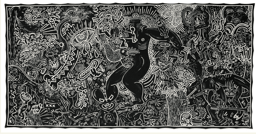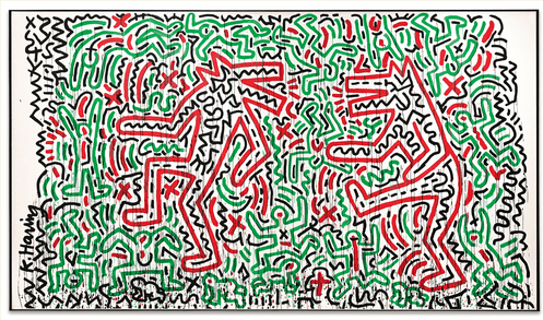 KEITH HARING 1958 – 1990 UNTITLED (DANCING DOGS) signed sumi ink and acrylic on paper mounted on canvas 108 x 191 1/2 in. 274.3 x 486.4 cm. Executed in 1981. Estimate 3,000,000 — 4,000,000 USD