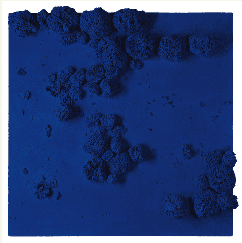 YVES KLEIN 1928 – 1962 RÉLIEF ÉPONGE BLEU (RE 51) signed and dated 59 on the reverse dry pigment and synthetic resin, natural sponges and pebbles on board 40 3/4 x 40 3/8 x 3 1/2 in. 103.5 x 102.5 x 9 cm. Estimate 15,000,000 — 20,000,000 USD