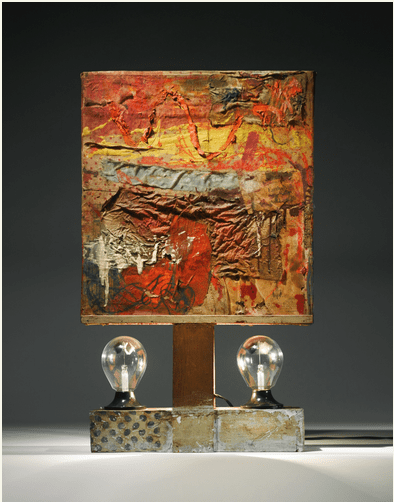 PROPERTY SOLD TO BENEFIT THE PAUL TAYLOR DANCE FOUNDATION ROBERT RAUSCHENBERG 1925 – 2008 COMBINE oil, charcoal, newspaper, canvas and fabric collage, lightbulb and two glass radiometers on nailed wooden structure 25 1/4 x 15 1/2 x 3 3/4 in. 64.1 x 39.4 x 9.5 cm. Executed circa 1954. Estimate 5,000,000 — 7,000,000 USD