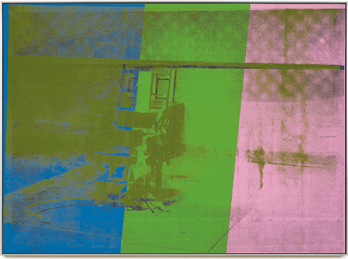 ANDY WARHOL 1928 – 1987 BIG ELECTRIC CHAIR acrylic and silkscreen ink on canvas 54 x 74 in. 137.2 x 187.9 cm. Executed in 1967-1968, this work is stamped twice by The Andy Warhol Foundation for the Visual Arts and The Estate of Andy Warhol and numbered PA57.011 on the overlap. Estimate 18,000,000 — 25,000,000 USD