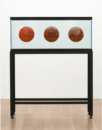 JEFF KOONS B.1955 THREE BALL 50/50 TANK (SPALDING DR. JK SILVER SERIES, WILSON HOME COURT, WILSON FINAL FOUR) glass, steel, distilled water and three basketballs 60 1/2 x 48 3/4 x 13 1/4 in. 153.7 x 123.8 x 33.7 cm. Executed in 1985, this work is number one of an edition of two and was formerly titled Three Ball 50/50 Tank (Wilson Aggressor, Wilson Supershot, Dr. J. Silver Series) Estimate 4,000,000 — 6,000,000 USD