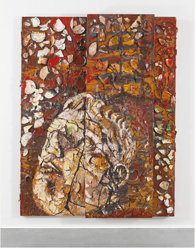 JULIAN SCHNABEL B. 1951 800 BLOWS signed on the reverse of the right panel broken ceramic, bondo and oil on wood, in three parts overall: 108 x 84 x 36 in. 274.3 x 213.3 x 91.4 cm. Executed in 1983. Estimate 1,000,000 — 1,500,000 USD