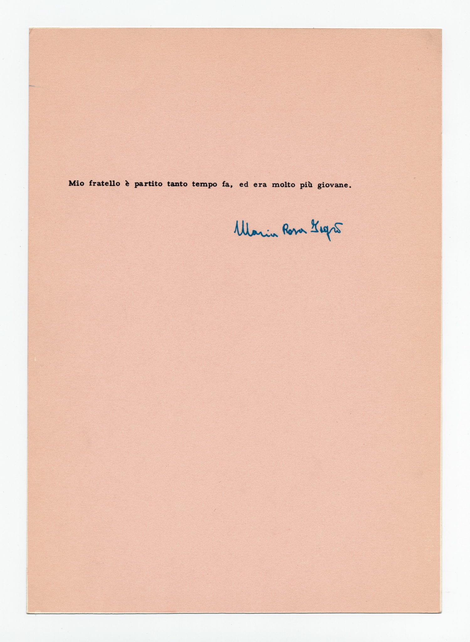 Si tratta di un’installazione per sette elementi, composta da altrettanti fogli di carta serigrafata (29,5×21 cm), sui quali si possono leggere le affermazioni dello stesso Isgrò e dei componenti della sua famiglia, che negano la sua identità.