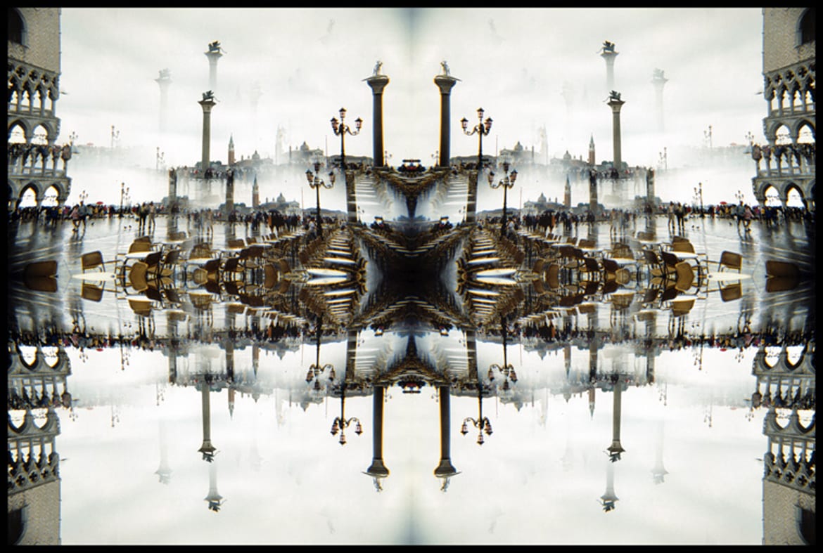 In Omaggio al Terragni e nelle Astrazione#1 e Astrazione#2 incentrate su New York, create negli anni Settanta e Ottanta, è evidente un forte limite di leggibilità e di visibilità delle strutture reali, celate da elementi simmetrici e speculari, mentre nello scatto Rotonda della Besana del 1972 sono più visibili, nel vorticoso alternarsi di volte e colonne, riferimenti alla struttura architettonica di origine. Un’espressività in continua evoluzione, infatti in Venezia Astratta, così come in altri lavori realizzati negli anni Novanta, il luogo creativamente rappresentato è di più facile identificazione.