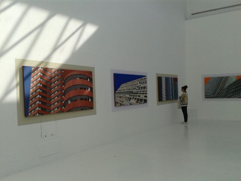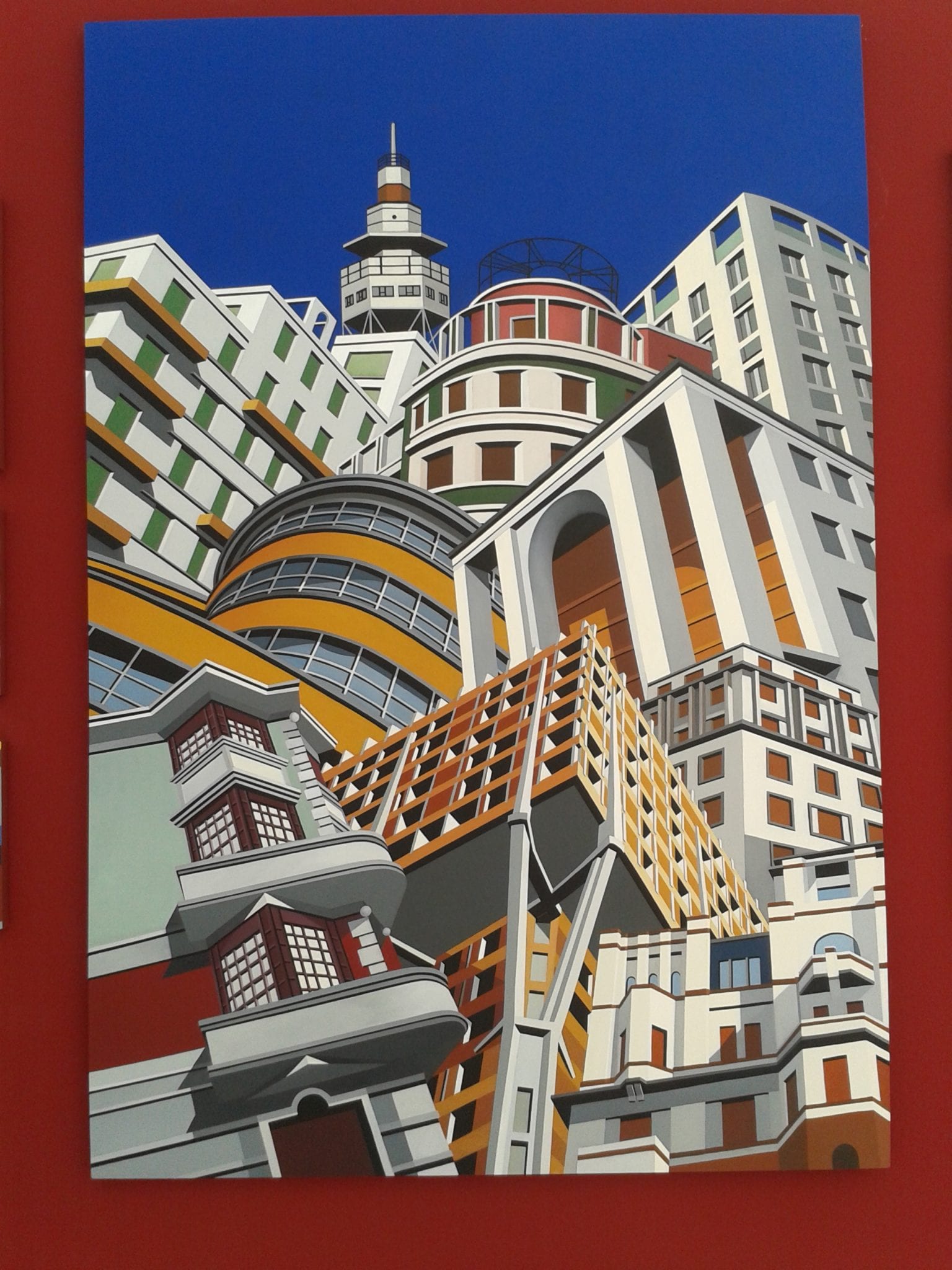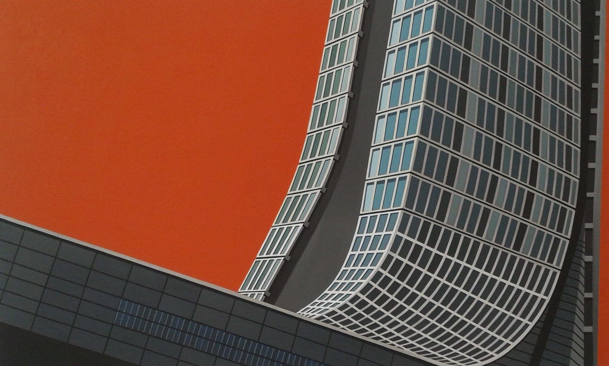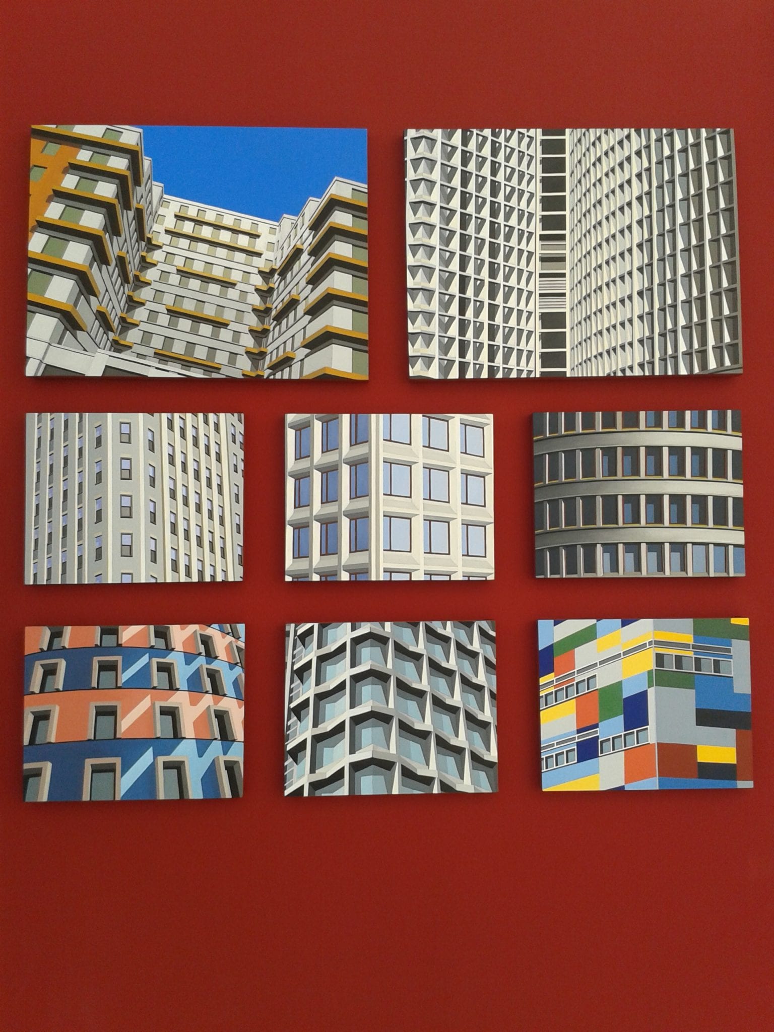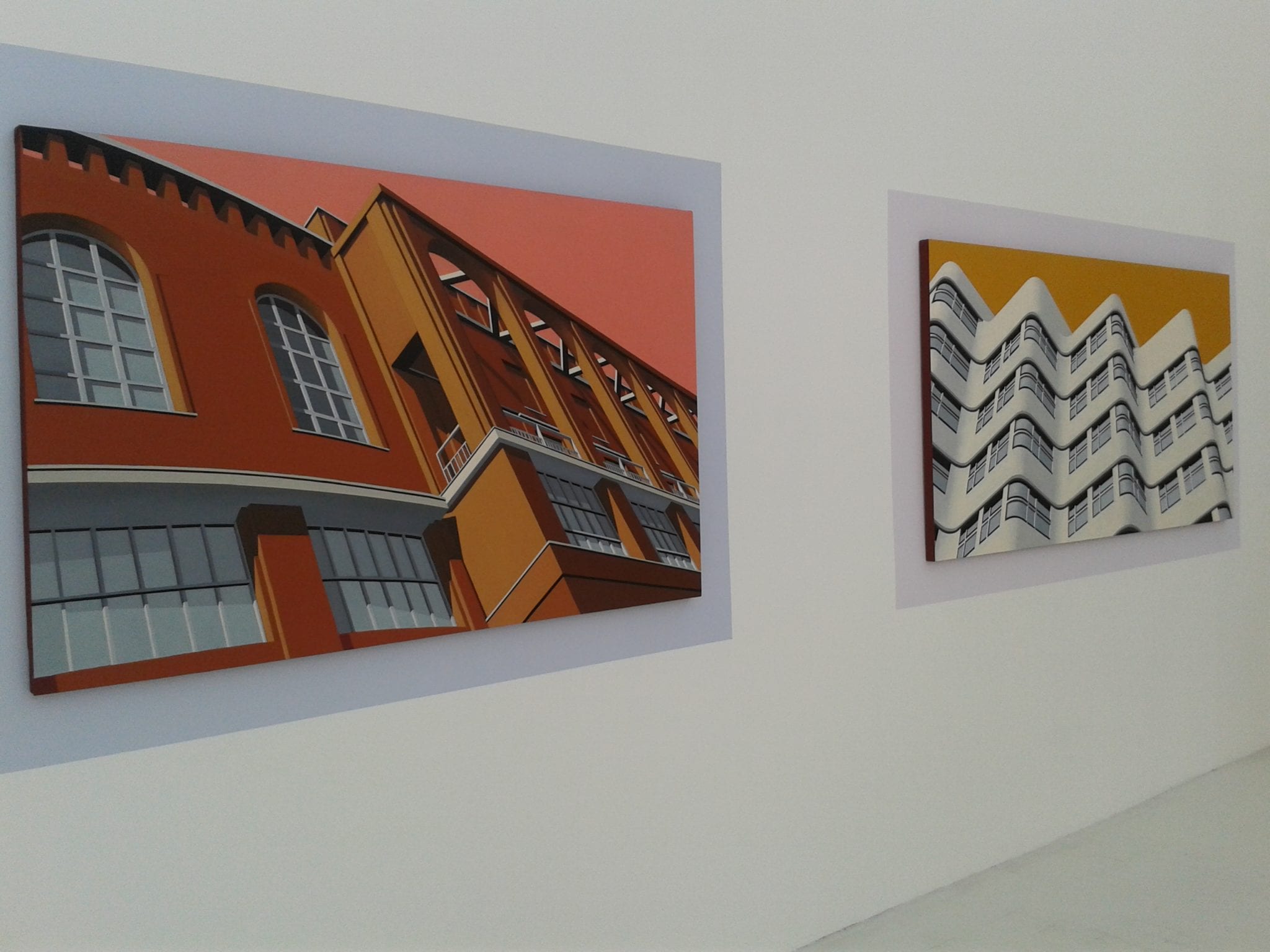 Sviluppa un linguaggio particolarissimo fatto di piatte monocromie, in cui l’architettura prende il sopravvento imponendosi prepotentemente su tutta la superficie della tela. Una veduta dall’alto, una dal basso, il dettaglio decontestualizzato di un palazzo, edifici ammassati in una irreale composizione: la fisicità di strutture realmente esistenti si fa immagine quasi astratta e allucinatoria nelle sue opere. Le città sono svuotate e appaiono sulla tela in un surreale silenzio che lascia spazio al sole, la cui luce bianca si infrange sulle nitide facciate prospetticamente distorte dei palazzi rappresentati dall’artista nei suoi quadri, dove il rimando a Edward Hopper è esplicito. Si compone così una città ideale, un tempio dell’architettura, un utopistico progetto di “Atlante urbano” nel quale si rintracciano tutte le linee di base e le strutture portanti dell’architettura moderna e contemporanea.