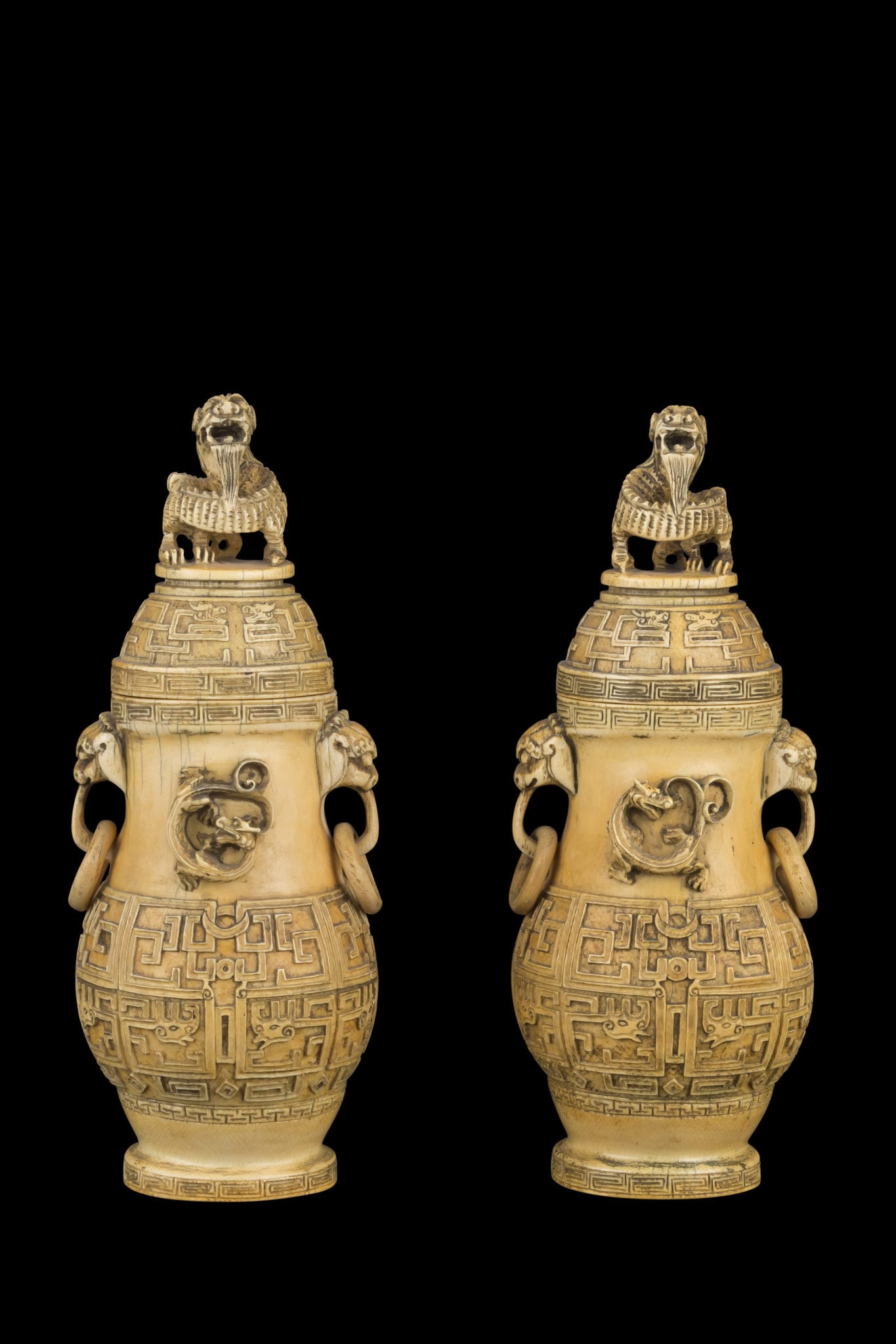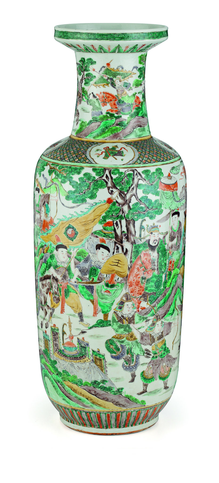 Dense di scene e di vivide cromie decorano una coppia di vasi in porcellana, famiglia verde a ‘rouleau’, Cina, dinastia Qing degli inizi del XIX secolo, decoro a scena continua su tutto il corpo, probabilmente tratta dal ‘The Romance of the Three Kingdoms’, con alti ufficiali al galoppo con lance e vessilli e soldati in corsa armati, sullo sfondo di montagne rocciose, alberi di pino, e la Grande Muraglia merlata, nuvole in cielo, sulle spalle motivo a losanghe intervallato da quattro riserve, decorate con alcuni degli otto simboli Buddhisti, scene simili sul collo, decoro a foglie stilizzate di palma sul bordo con una piccola fascia di losanghe (lotto 137 stima 5.500 – 7.500 euro).