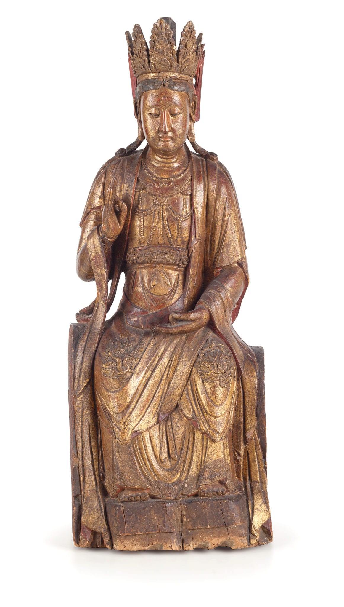 Di grande fascino, infine una grande scultura in legno laccato e dorato di epoca Ming del XIV secolo, raffigurante Avalokitesvara, la divinità buddhista più venerata, alta un metro e venti (lotto 77 stima 14.000 – 20.000 euro).
