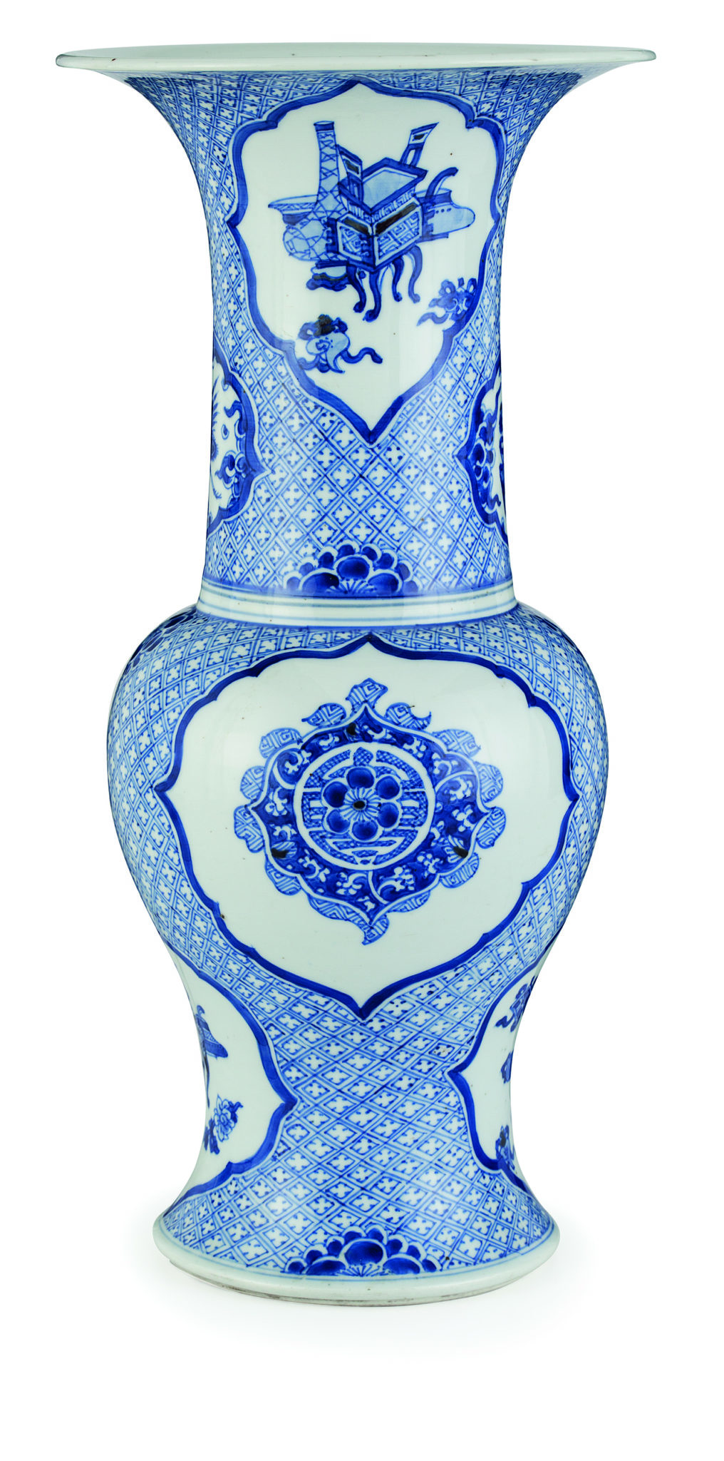 Raffinato nella sua essenzialità, un vaso in porcellana bianca e blu e rosso di rame, Cina, dinastia Qing, epoca Kangxi, decorato con otto cartigli lobati, ciascuno racchiude una decorazione alternata con composizioni di vasi, incensieri e gli otto simboli Buddhisti, una gru in volo ed un grande medaglione stilizzato con ramoscelli e corolle di fiori, sottostante, uno degli otto attributi ‘Trigrammi’ (bàguà), il tutto riservato su un fondo con un motivo reticolato a piccoli rombi e alternate corolle, divisi sul bordo da una fascia geometrica e alla spalla e il piede da due linee blu (lotto 136, stima 13.000 – 15.000 euro).