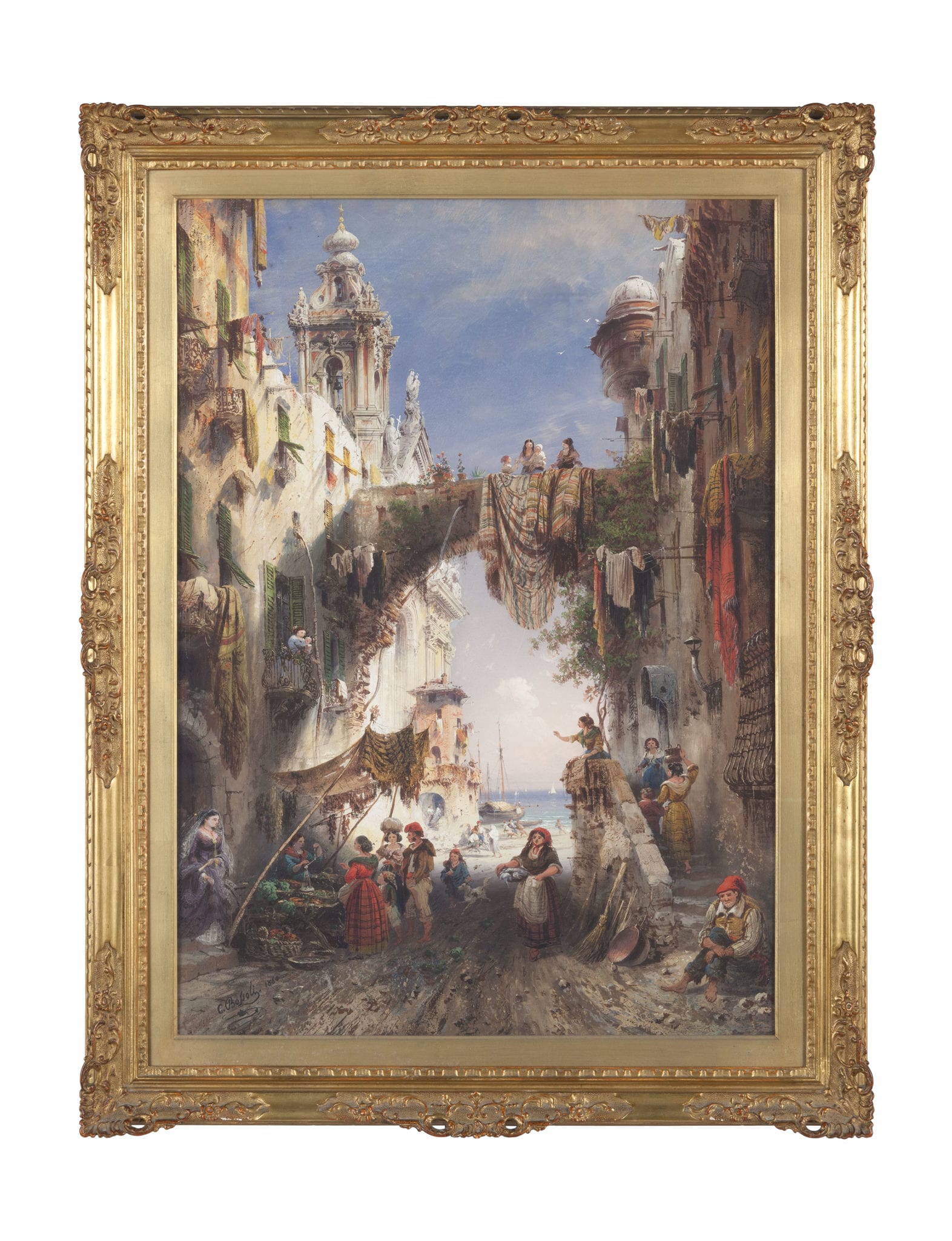 Di Carlo Bossoli (Lugano 1815 – Torino 1884) pittore e scenografo luganese naturalizzato italiano, dotato di una felicità realizzativa apprezzata da un pubblico tanto selettivo quanto internazionale, una tempera su carta raffigurante un Vicolo su mare a Cadice, opera che si fa apprezzare per lo sfavillante e luminoso cromatismo e per una ariosità della tavolozza – data da una tecnica che mescolava pigmenti in polvere con un’emulsione di acqua e olio di lino, papavero e girasole – che restituisce effetti di trasparenza molto simili all’acquarello (lotto 515 stima 25.000 – 30.000 euro).