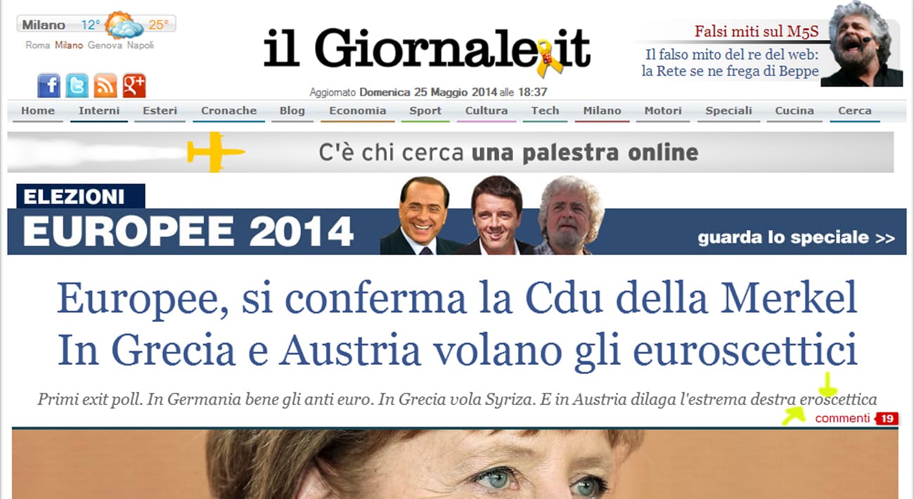 Mentre tutti si impegnano in discorsi più o meno seri sui possibili risultati delle elezioni europee, comunali e regionali (Piemonte e Abruzzo) in Italia e nei primi commenti agli exit poll delle europee in Germania e in Grecia, noi per abbassare la tensione e ridere un pochino abbiamo pescato un curioso refuso (corretto dopo una ventina di minuti) dei pur bravissimi colleghi de IlGiornale.it (la versione online del quotidiano della famiglia Berlusconi) in cui nel sottotitolo in Home Page vi era scritto che in Austria “dilaga l’estrema destra eroscettica” anzichè ovviamente “euroscettica”. Beh detto dal quotidiano di Berlusconi forse segnala un repentino cambiamento della linea politica. 😆 L'”eroscetticismo” farebbe veramente molto bene alla classe politica italiana visto gli scandali in cui è stata coinvolta in questi ultimi vent’anni. Facciamoci una risata, ovviamente il refuso è stato presto corretto. Capita a chiunque, noi per primi. Sia chiaro abbiamo voluto pubblicarlo solo perchè è veramente molto divertente. Che l’eros scetticismo dilaghi dunque !