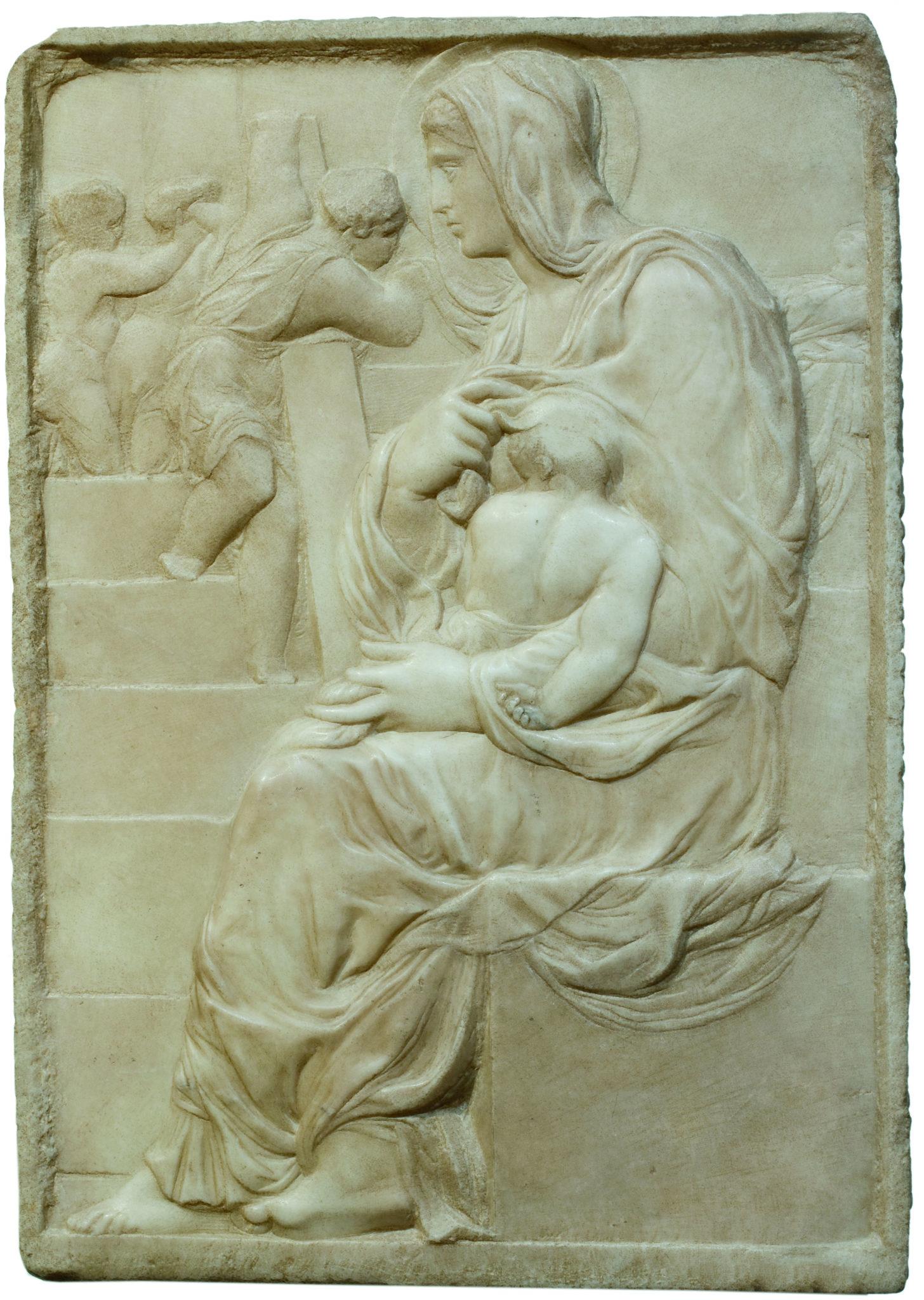 La passione di Michelangelo per la scultura, che considerava l’arte per eccellenza perché si fa “per via di levare” materia, permea la biografia scritta da Irving Stone (Il tormento e l’estasi) in cui sono narrati i suoi primi anni trascorsi con una famiglia di scalpellini invece che a studiare legge come avrebbe voluto il padre. Gli piaceva girare per le cave all’alba quando il marmo era bagnato dalla rugiada per vederne, attraverso i riflessi, le venature e le imperfezioni. Fu “una vena che si scoperse nel marmo della faccia”, apparsa durante la lavorazione, di una statua del “Christo ignudo con la Croce” che lo indusse ad abbandonare l’opera (commissionata da Metello Vari e destinata alla chiesa della Minerva), oggi identificata con quella di Bassano Romano: il Cristo Giustiniani 1514-1516. Con questa opera imponente, portata a termine da un ignoto scultore del sec. XVII (ora nella chiesa di San Vincenzo Martire), inizia, nella sala Orazi e Curiazi, il percorso espositivo. Nella stessa sala desta meraviglia la piccola, ma monumentale, Madonna della scala (1490 c.), una prima riflessione sulla maternità dell’adolescente Michelangelo, che supera presto il classicismo di Donatello.