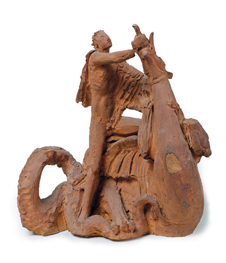 Un’intensa scultura degli anni Trenta di Arturo Martini (1889 – 1947) raffigurante San Giorgio e il drago (altezza cm 59), ci introduce all’opera di uno dei più grandi scultori del XX secolo (lotto 22 stima 25.000 – 30.000 euro). Partendo da una formazione simbolista, si forgia in numerosi viaggi di formazione a Parigi – dove conosce e frequenta Umberto Boccioni e Amedeo Modigliani – e a Monaco con Adolf von Hildebrand, fino a raggiungere uno stile che è sintesi di linearità simbolica, contenuto espressivo e autonomia della forma plastica.