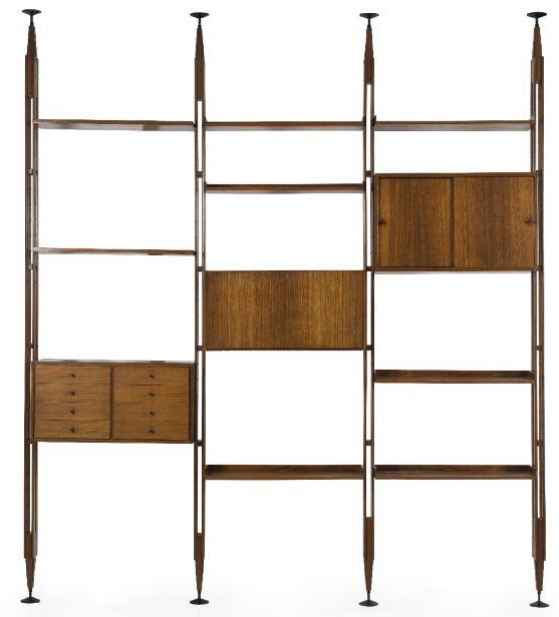 La libreria Lb7 realizzata per Poggi nel 1957 in legno di palissandro e alluminio verniciato è un esempio di misura ed eleganza, un contrappunto tra forma e spazio, che ancora oggi incanta per la sua moderna classicità (lotto 517 stima 3.500 – 4.000).