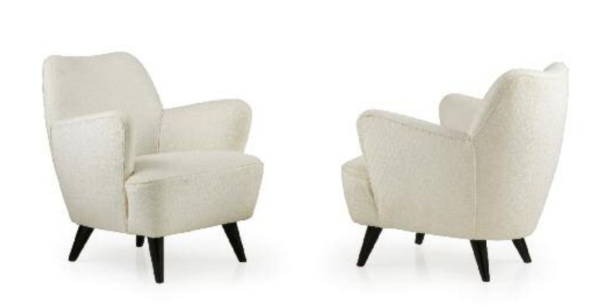 Un esempio ci viene da una coppia di poltrone bianche con schienale alto del 1949 per il salone delle feste di prima classe del transatlantico “Conte Biancamano” (stima 1500-1800 euro). Varato nel 1925 nel 1948 venne sottoposta ad importanti lavori di ammodernamento nei Cantieri di Monfalcone. Al riallestimento collaborarono pittori come Massimo Campigli, Mario Sironi, Roberto Crippa, Edina Altara, all’arredo e alla decorazione parteciparono Gustavo Pulitzer e Giò Ponti mentre le sculture erano opera di Marcello Mascherini. Tra le sculture, quella dell’ampio soffitto che ornava il salone delle feste che raffigurava il mito di Giasone e del vello d’oro.