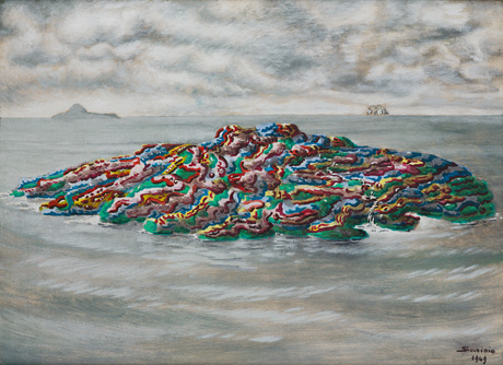 Alberto Savinio, forse ancor più del metafisico fratello Giorgio de Chirico, è l’artista dell’abbandono onirico, dove realtà e finzione sono parti speculari di un mondo mitologico sensuale e mediterraneo fatto di ironia ed inganni, dove ciò che sembra è solo un riflesso di una surreale memoria perduta. Ogni immagine un’isola illusoria dei nostri sensi come la vibrante tempera su masonite del 1949 dall’evocativo titolo “L’isola preziosa” (lotto 90 stima 60.000 – 80.000 euro).