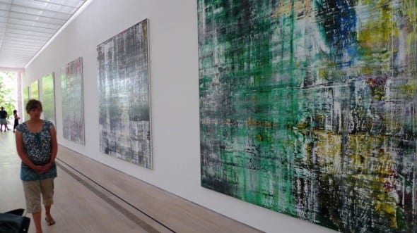 Ma quest’anno Gerhard Richter, letteralmente, dilaga in tutti gli spazi utilizzabili per le mostre temporanee nello stupendo edificio. Qualche centinaio di immagini, molte enormi, -ritratti, nature morte, paesaggi, immagini astratte- insieme a due istallazioni in vetro e sessantaquattro recenti fotografie pitturate. La selezione comprende i grandi periodi nella carriera di Richter dal 1966, incluse opere recenti non ancora viste in pubblico.